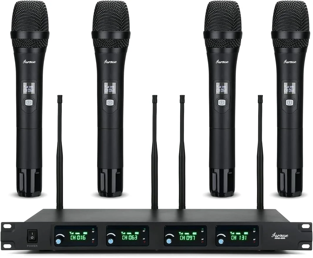 Asmuse Wireless Microphone System,4-Channel UHF Metal Cordless Wireless Mic, Fixed Frequency,4 Handheld Dynamic Microphones, Microphone for Party/Wedding/Speech/Church/Stage/Karaoke/DJ(MF-4400)
